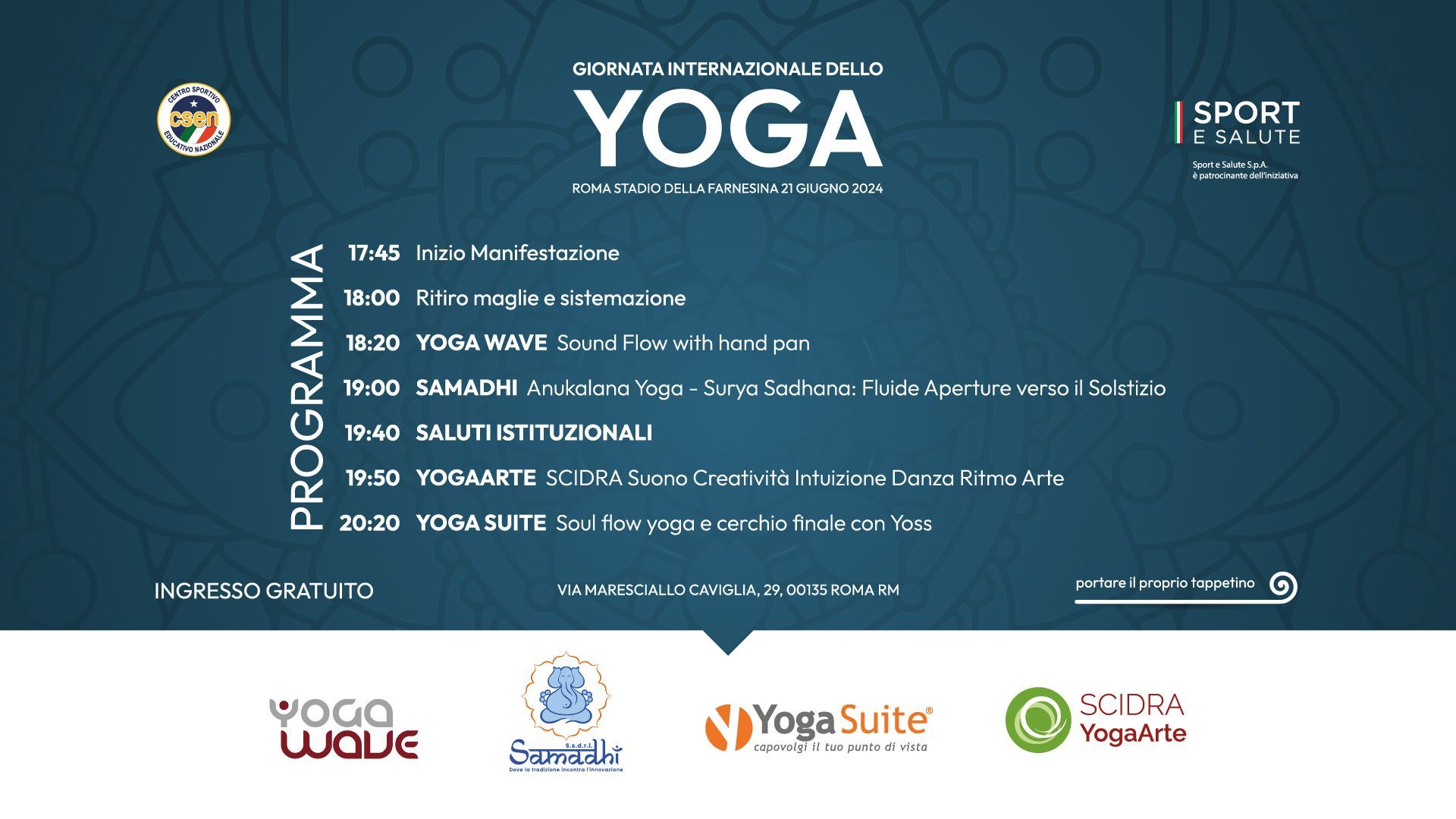 Nel 2023 lo YOGA DAY si è svolto presso lo Stadio della Farnesina di Roma dalle ore 17,30-22,00 con il patrocinio di Sport e Salute e del Comune di Roma Assessorato ai Grandi Eventi, Sport, Turismo e Moda.